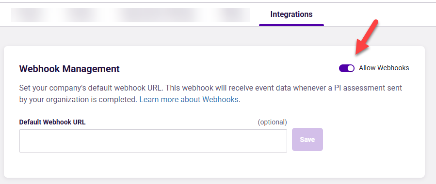 Webhook API calls are controlled through the "Allow Webhooks" toggle control within your Integrations Admin screen. To receive webhook calls, regardless if they are for Single or Default webhook URL's, requires you to enable the toggle control [Screenshot below].